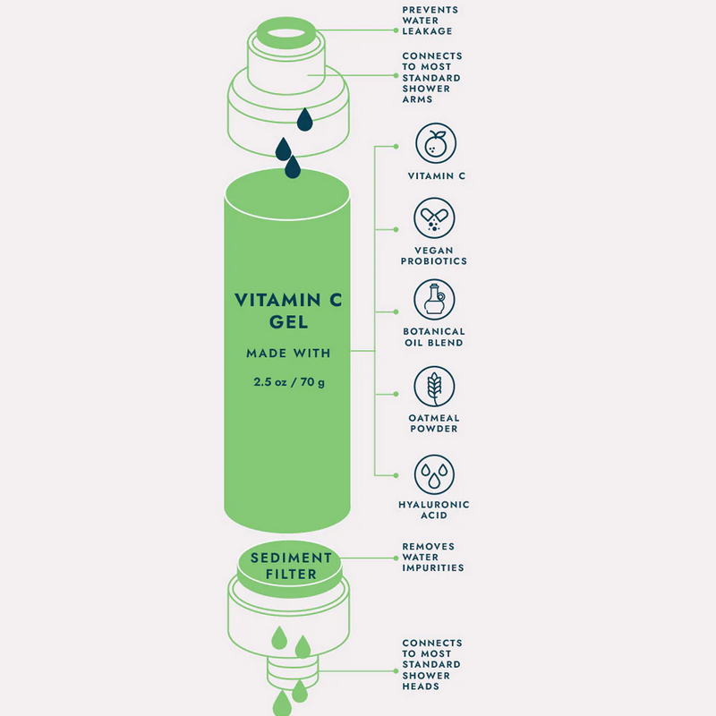 El filtro contiene Vitamina C natural, conocida por sus propiedades antioxidantes. Funciona para neutralizar el cloro y otras sustancias dañinas en el agua de tu ducha, asegurando una experiencia limpia y refrescante.
