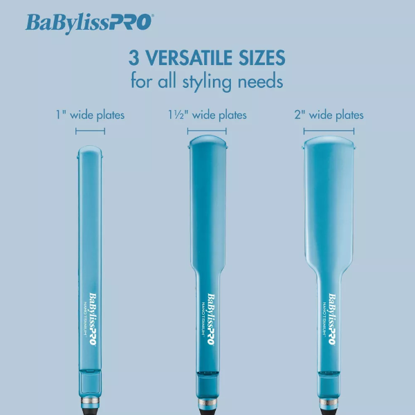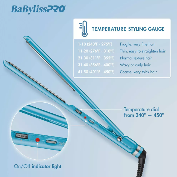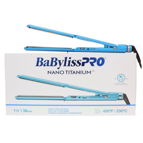 BaBylissPRO Nano Titanium-Plated Ionic Straightening Iron with extra-long 5-inch plates heats up to 450°F for faster, smoother styling. Ultra-thin, lightweight design reduces hand fatigue while delivering professional results.